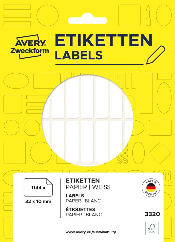 Samolepící štítky Avery Zweckform 3320 na jednoduché a přehledné značení nebo uspořádávání. Chcete rychle a jednoduše uspořádat a identifikovat složky na pracovním stole nebo si doma přehledně rozčlenit a označit nejrůznější dokumenty a nemáte zrovna přístup k tiskárně? Nabízíme Vám univerzální samolepky o rozměru 32×10 mm, které snadno popíšete propiskou nebo fixem. Spolehlivě drží na všech běžných typech povrchů a můžete si vybrat ze široké škály rozměrů, v menších i větších baleních. Bílé samolepící etikety na ruční popis Avery 3320 jsou ideální pro rychlé a snadné použití doma nebo v kanceláři.