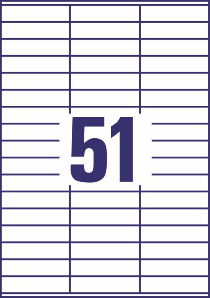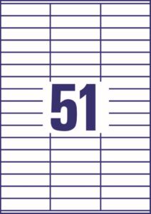rozměr 70×16,7 mm, 100 archů A4, 5.100 ks etiket v balení (51 ks/arch), papírové, permanentní lepidlo, barva bílá. Typ tiskárny: černobílá laserová, barevná laserová, inkoustová.