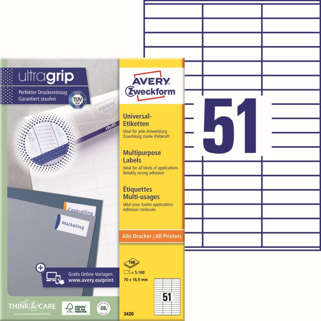 Univerzální samolepící etikety Avery Zweckform 3420 do kanceláře, obchodu i domácnosti. Vysoká a stálá lepivost na běžných površích jako papír, karton, sklo a plast. Novinka! Unikátní výrobní technologie Ultragrip – do oblasti záhlaví, zápatí a na boční okraje zadní strany archu s etiketami aplikovaná jemná vrstva laku a 3D strukturovaný povrch, který společně s vyznačenými okraji a vodícími linkami zaručí bezchybné natažení archu do tiskárny a absolutně přesný tisk bez rizika uvíznutí archu v tiskárně. Ukázka viz Videa (záložka výše). Při tisku se můžete spolehnout na čtyřstranný bezpečnostní okraj QCT (Quattro Clean Technology), který zabraňuje vytékání a usazování lepidla v tiskárně a ostrý tiskový výstup, který se díky vynikajícímu ukotvení tonerového prášku nebo inkoustu nerozmazává. Bezproblémový provoz laserových tiskáren testován a potvrzen certifikátem TÜV SÜD. Print etikety Avery 3420 jsou vhodné pro všechny běžné laserové i inkoustové tiskárny, kopírovací stroje a hodí se i pro psaní, resp. ruční popis.