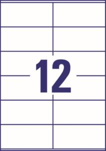 rozměr 105×48 mm, 10 archů A4, 120 ks etiket v balení (12 ks/arch), papírové, permanentní lepidlo, barva bílá. Typ tiskárny: černobílá laserová, barevná laserová, inkoustová.