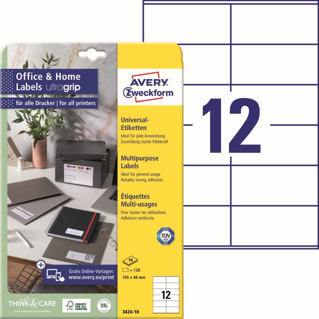 Univerzální samolepící etikety Avery Zweckform 3424-10 do kanceláře, obchodu i domácnosti. Vysoká a stálá lepivost na běžných površích jako papír, karton, sklo a plast. Novinka! Unikátní výrobní technologie Ultragrip – do oblasti záhlaví, zápatí a na boční okraje zadní strany archu s etiketami aplikovaná jemná vrstva laku a 3D strukturovaný povrch, který společně s vyznačenými okraji a vodícími linkami zaručí bezchybné natažení archu do tiskárny a absolutně přesný tisk bez rizika uvíznutí archu v tiskárně. Ukázka viz Videa (záložka výše). Při tisku se můžete spolehnout na čtyřstranný bezpečnostní okraj QCT (Quattro Clean Technology), který zabraňuje vytékání a usazování lepidla v tiskárně a ostrý tiskový výstup, který se díky vynikajícímu ukotvení tonerového prášku nebo inkoustu nerozmazává. Bezproblémový provoz laserových tiskáren testován a potvrzen certifikátem TÜV SÜD. Bílé samolepící štítky Avery 3424-10 jsou vhodné pro všechny běžné laserové i inkoustové tiskárny, kopírovací stroje a hodí se i pro psaní, resp. ruční popis.