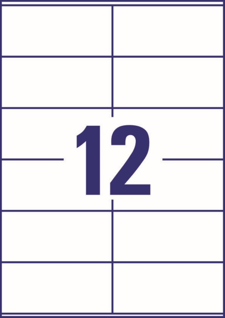rozměr 105×48 mm, 220 archů A4, 2.640 ks etiket v balení (12 ks/arch), papírové, permanentní lepidlo, barva bílá. Typ tiskárny: černobílá laserová, barevná laserová, inkoustová.