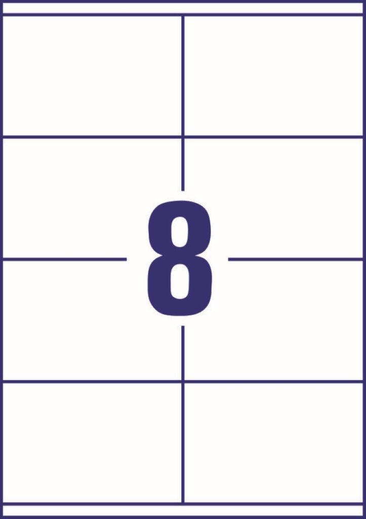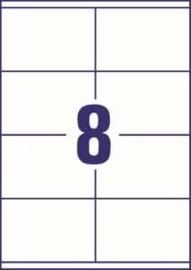 rozměr 105×70 mm, 100 archů A4, 800 ks etiket v balení (8 ks/arch), papírové, permanentní lepidlo, barva bílá. Typ tiskárny: černobílá laserová, barevná laserová, inkoustová.