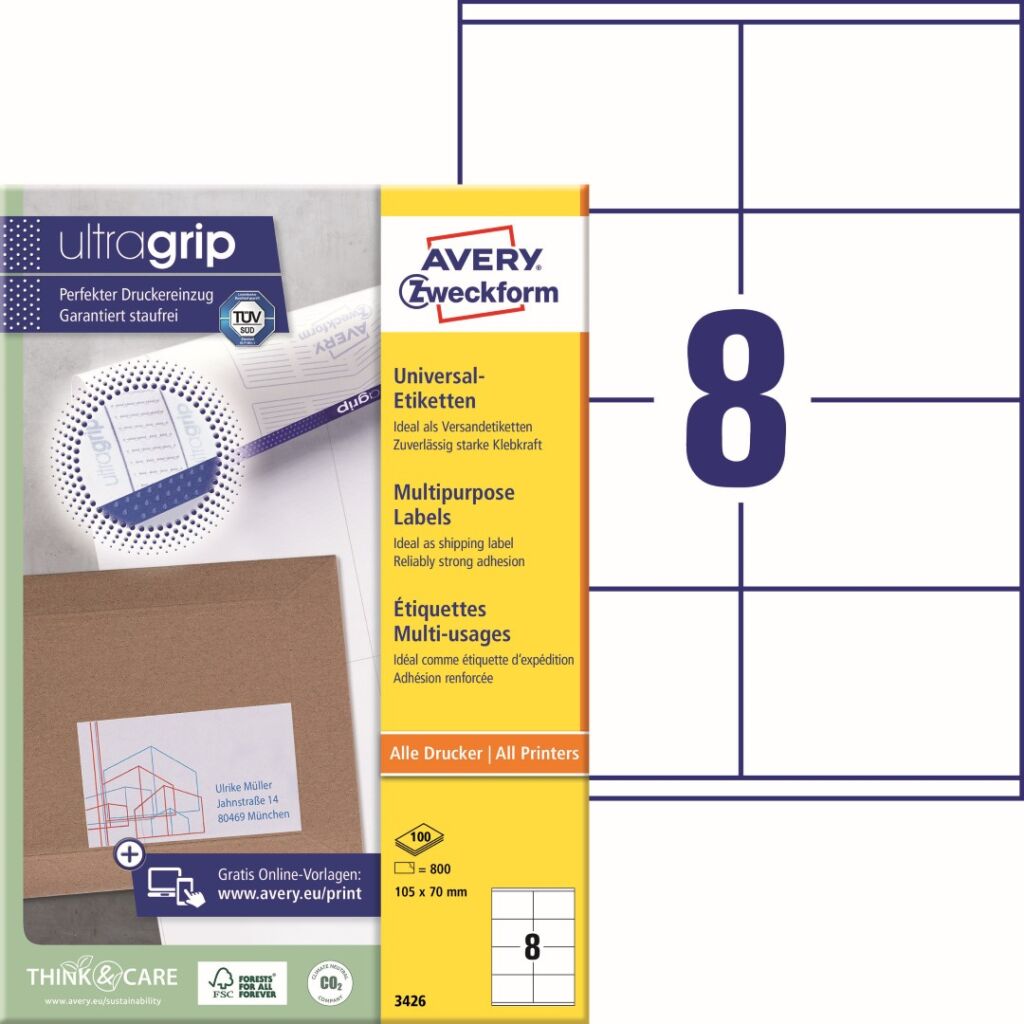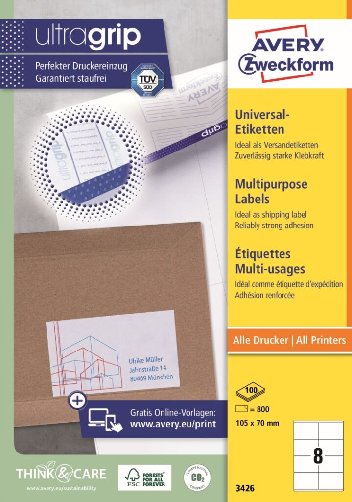 Univerzální samolepící etikety Avery Zweckform 3426 do kanceláře, obchodu i domácnosti. Vysoká a stálá lepivost na běžných površích jako papír, karton, sklo a plast. Novinka! Unikátní výrobní technologie Ultragrip – do oblasti záhlaví, zápatí a na boční okraje zadní strany archu s etiketami aplikovaná jemná vrstva laku a 3D strukturovaný povrch, který společně s vyznačenými okraji a vodícími linkami zaručí bezchybné natažení archu do tiskárny a absolutně přesný tisk bez rizika uvíznutí archu v tiskárně. Ukázka viz Videa (záložka výše). Při tisku se můžete spolehnout na čtyřstranný bezpečnostní okraj QCT (Quattro Clean Technology), který zabraňuje vytékání a usazování lepidla v tiskárně a ostrý tiskový výstup, který se díky vynikajícímu ukotvení tonerového prášku nebo inkoustu nerozmazává. Bezproblémový provoz laserových tiskáren testován a potvrzen certifikátem TÜV SÜD. Samolepící print etikety Avery 3426 jsou vhodné pro všechny běžné laserové i inkoustové tiskárny, kopírovací stroje a hodí se i pro psaní, resp. ruční popis.
