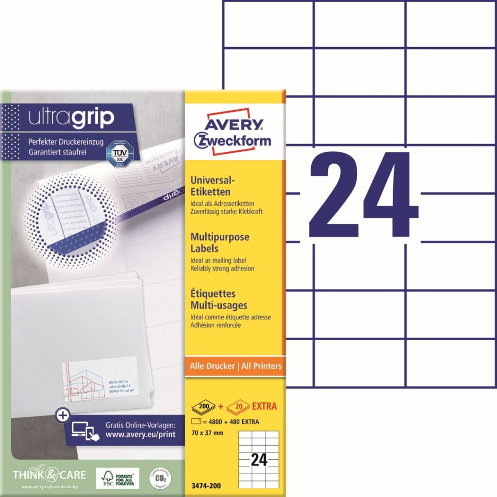Univerzální samolepící etikety Avery Zweckform 3475-200 do kanceláře, obchodu i domácnosti. Vysoká a stálá lepivost na běžných površích jako papír, karton, sklo a plast. Novinka! Unikátní výrobní technologie Ultragrip – do oblasti záhlaví, zápatí a na boční okraje zadní strany archu s etiketami aplikovaná jemná vrstva laku a 3D strukturovaný povrch, který společně s vyznačenými okraji a vodícími linkami zaručí bezchybné natažení archu do tiskárny a absolutně přesný tisk bez rizika uvíznutí archu v tiskárně. Ukázka viz Videa (záložka výše). Při tisku se můžete spolehnout na čtyřstranný bezpečnostní okraj QCT (Quattro Clean Technology), který zabraňuje vytékání a usazování lepidla v tiskárně a ostrý tiskový výstup, který se díky vynikajícímu ukotvení tonerového prášku nebo inkoustu nerozmazává. Bezproblémový provoz laserových tiskáren testován a potvrzen certifikátem TÜV SÜD. Samolepící štítky Avery 3475-200 jsou vhodné pro všechny běžné laserové i inkoustové tiskárny, kopírovací stroje a hodí se i pro psaní, resp. ruční popis.