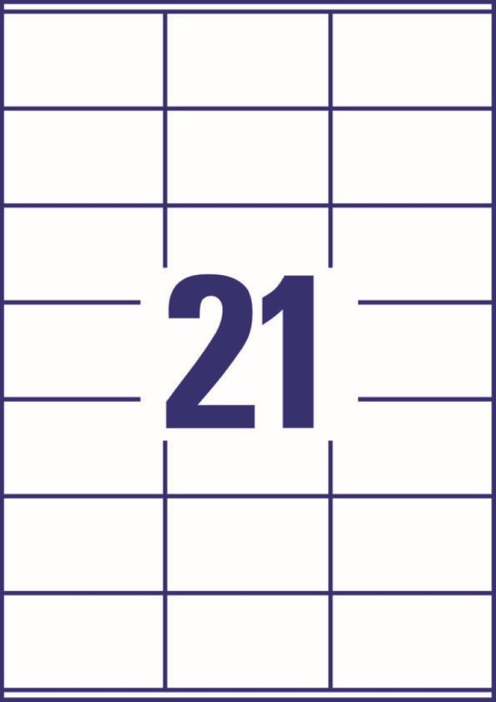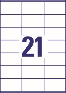 rozměr 70×41 mm, 10 archů A4, 210 ks etiket v balení (21 ks/arch), papírové, permanentní lepidlo, barva bílá. Typ tiskárny: černobílá laserová, barevná laserová, inkoustová.