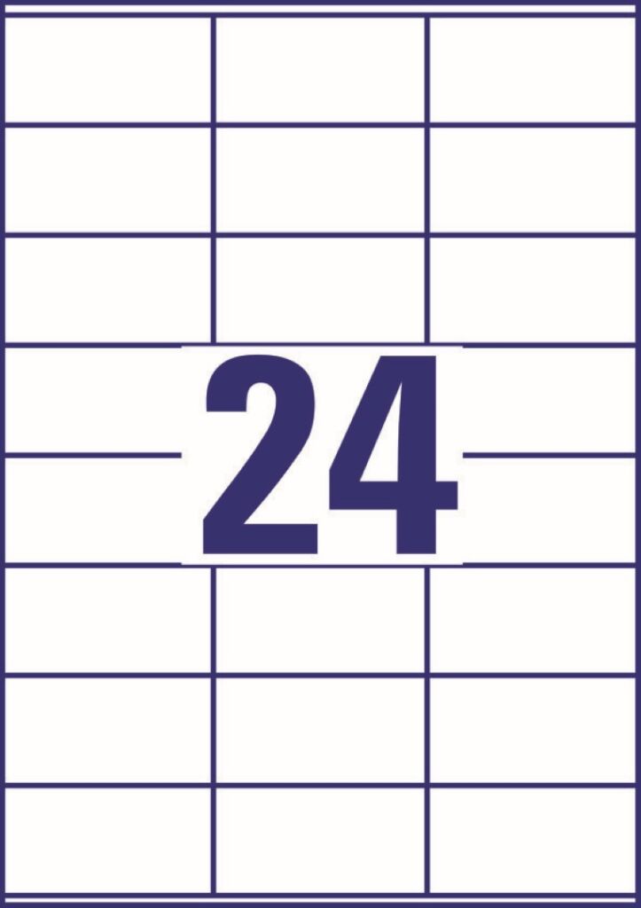 rozměr 70×36 mm, 30 archů A4, 720 ks etiket v balení (24 ks/arch), papírové, permanentní lepidlo, barva bílá. Typ tiskárny: černobílá laserová, barevná laserová, inkoustová.