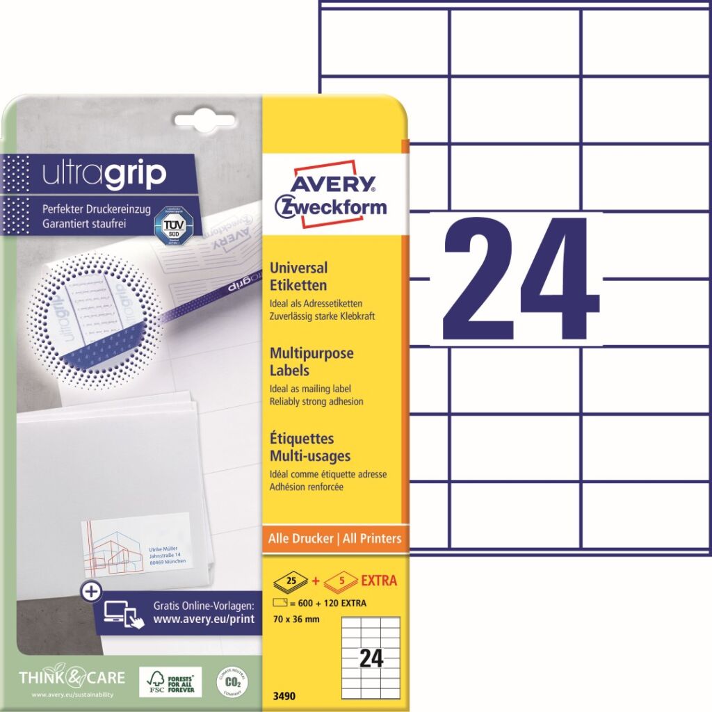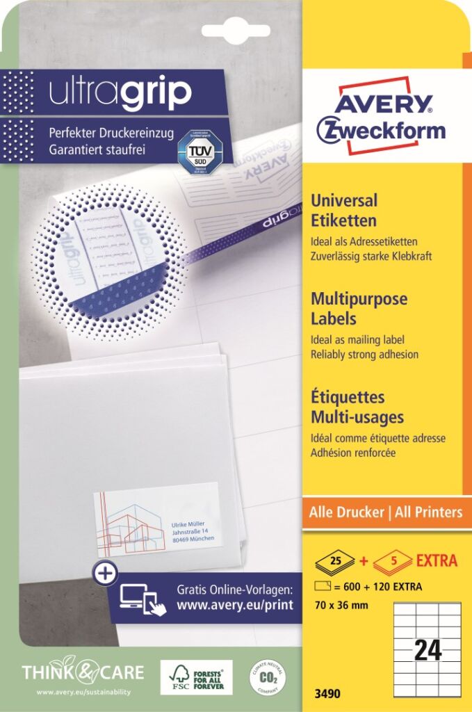 Univerzální samolepící etikety Avery Zweckform 3490 do kanceláře, obchodu i domácnosti. Vysoká a stálá lepivost na běžných površích jako papír, karton, sklo a plast. Novinka! Unikátní výrobní technologie Ultragrip – do oblasti záhlaví, zápatí a na boční okraje zadní strany archu s etiketami aplikovaná jemná vrstva laku a 3D strukturovaný povrch, který společně s vyznačenými okraji a vodícími linkami zaručí bezchybné natažení archu do tiskárny a absolutně přesný tisk bez rizika uvíznutí archu v tiskárně. Ukázka viz Videa (záložka výše). Při tisku se můžete spolehnout na čtyřstranný bezpečnostní okraj QCT (Quattro Clean Technology), který zabraňuje vytékání a usazování lepidla v tiskárně a ostrý tiskový výstup, který se díky vynikajícímu ukotvení tonerového prášku nebo inkoustu nerozmazává. Bezproblémový provoz laserových tiskáren testován a potvrzen certifikátem TÜV SÜD. Samolepící etikety A4 Avery 3490 jsou vhodné pro všechny běžné laserové i inkoustové tiskárny, kopírovací stroje a hodí se i pro psaní, resp. ruční popis.