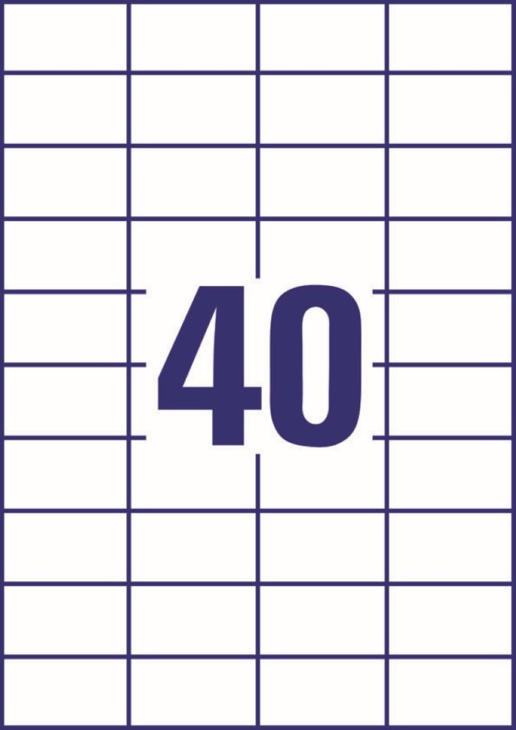 rozměr 52,5×29,7 mm, 100 archů A4, 4.000 ks etiket v balení (40 ks/arch), papírové, permanentní lepidlo, barva bílá. Typ tiskárny: černobílá laserová, barevná laserová, inkoustová.