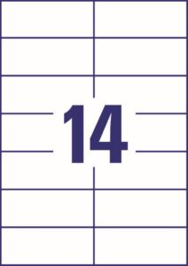 rozměr 105×42,3 mm, 100 archů A4, 1.400 ks etiket v balení (14 ks/arch), papírové, permanentní lepidlo, barva bílá. Typ tiskárny: černobílá laserová, barevná laserová, inkoustová.