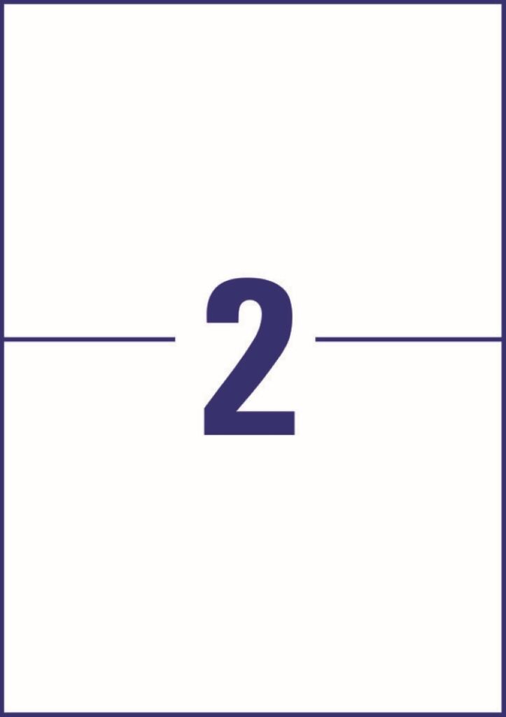rozměr 210×148 mm, 10 archů A4, 20 ks etiket v balení (2 ks/arch), papírové, permanentní lepidlo, barva bílá. Typ tiskárny: černobílá laserová, barevná laserová, inkoustová.