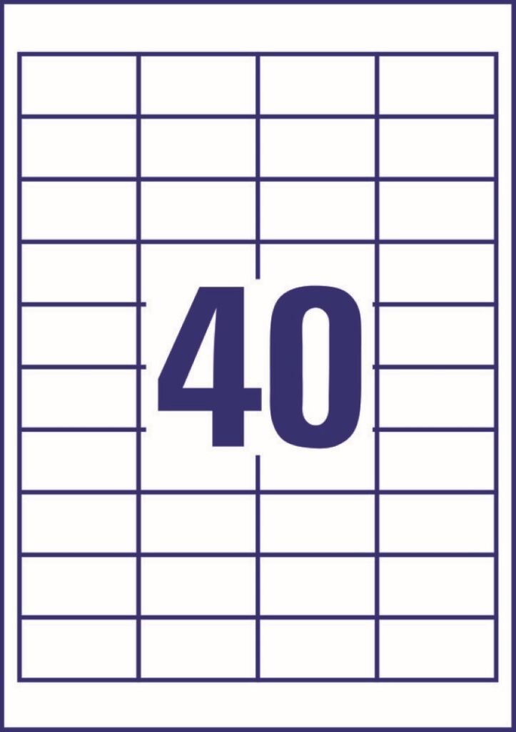 rozměr 48,5×25,4 mm, 220 archů A4, 8.800 ks etiket v balení (40 ks/arch), papírové, permanentní lepidlo, barva bílá. Typ tiskárny: černobílá laserová, barevná laserová, inkoustová.