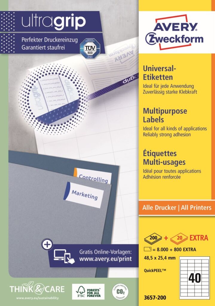 Univerzální samolepící etikety Avery Zweckform 3657 do kanceláře, obchodu i domácnosti. Vysoká a stálá lepivost na běžných površích jako papír, karton, sklo a plast. Díky praktické pomůcce QuickPEEL™ můžete jednotlivé etikety z lineru odlepovat snadno a rychle. Novinka! Unikátní výrobní technologie Ultragrip – do oblasti záhlaví, zápatí a na boční okraje zadní strany archu s etiketami aplikovaná jemná vrstva laku a 3D strukturovaný povrch, který společně s vyznačenými okraji a vodícími linkami zaručí bezchybné natažení archu do tiskárny a absolutně přesný tisk bez rizika uvíznutí archu v tiskárně. Ukázka viz Videa (záložka výše). Při tisku se můžete spolehnout na čtyřstranný bezpečnostní okraj QCT (Quattro Clean Technology), který zabraňuje vytékání a usazování lepidla v tiskárně a ostrý tiskový výstup, který se díky vynikajícímu ukotvení tonerového prášku nebo inkoustu nerozmazává. Bezproblémový provoz laserových tiskáren testován a potvrzen certifikátem TÜV SÜD. Print etikety Avery 3657 jsou vhodné pro všechny běžné laserové i inkoustové tiskárny, kopírovací stroje a hodí se i pro psaní, resp. ruční popis.