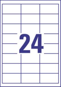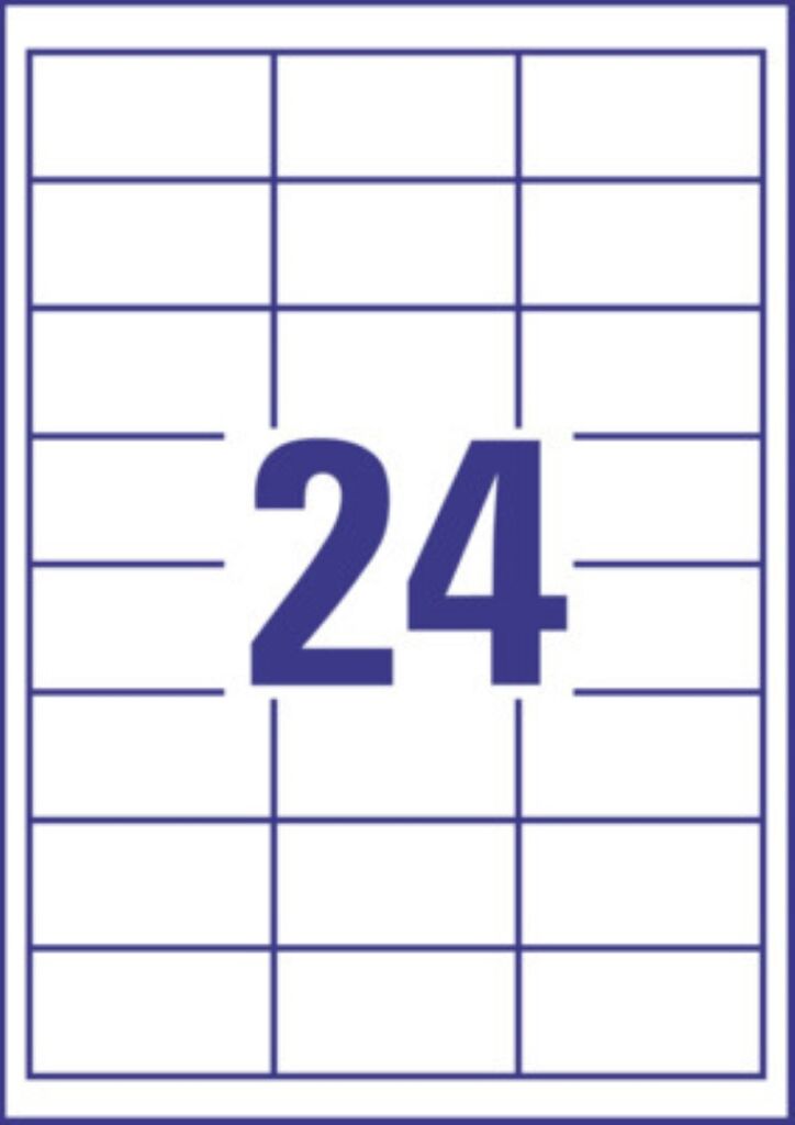 rozměr 64,6×33,8 mm, 100 archů A4, 2.400 ks etiket v balení (24 ks/arch), papírové, permanentní lepidlo, barva bílá. Typ tiskárny: černobílá laserová, barevná laserová, inkoustová.