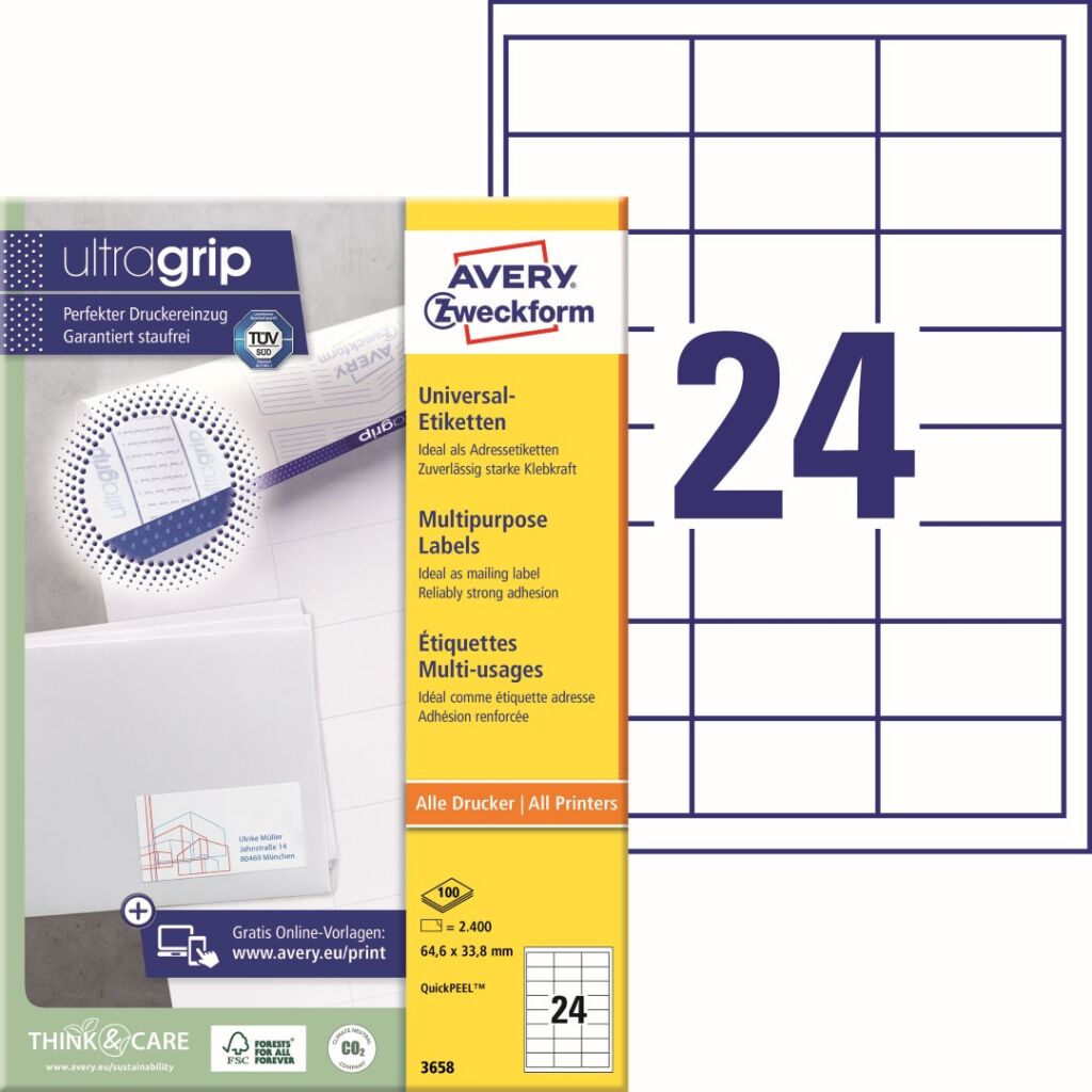 Univerzální samolepící etikety Avery Zweckform 3658 do kanceláře, obchodu i domácnosti. Vysoká a stálá lepivost na běžných površích jako papír, karton, sklo a plast. Díky praktické pomůcce QuickPEEL™ můžete jednotlivé etikety z lineru odlepovat snadno a rychle. Novinka! Unikátní výrobní technologie Ultragrip – do oblasti záhlaví, zápatí a na boční okraje zadní strany archu s etiketami aplikovaná jemná vrstva laku a 3D strukturovaný povrch, který společně s vyznačenými okraji a vodícími linkami zaručí bezchybné natažení archu do tiskárny a absolutně přesný tisk bez rizika uvíznutí archu v tiskárně. Ukázka viz Videa (záložka výše). Při tisku se můžete spolehnout na čtyřstranný bezpečnostní okraj QCT (Quattro Clean Technology), který zabraňuje vytékání a usazování lepidla v tiskárně a ostrý tiskový výstup, který se díky vynikajícímu ukotvení tonerového prášku nebo inkoustu nerozmazává. Bezproblémový provoz laserových tiskáren testován a potvrzen certifikátem TÜV SÜD. Print etikety Avery 3658 jsou vhodné pro všechny běžné laserové i inkoustové tiskárny, kopírovací stroje a hodí se i pro psaní, resp. ruční popis.