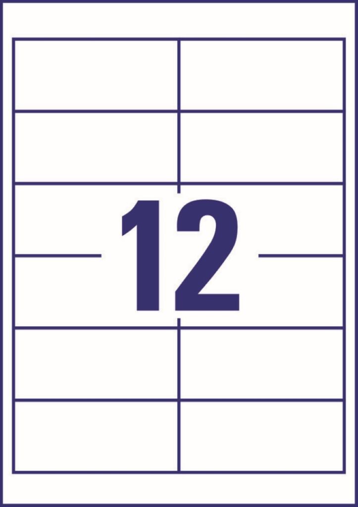 rozměr 97×42,3 mm, 100 archů A4, 1.200 ks etiket v balení (12 ks/arch), papírové, permanentní lepidlo, barva bílá. Typ tiskárny: černobílá laserová, barevná laserová, inkoustová.