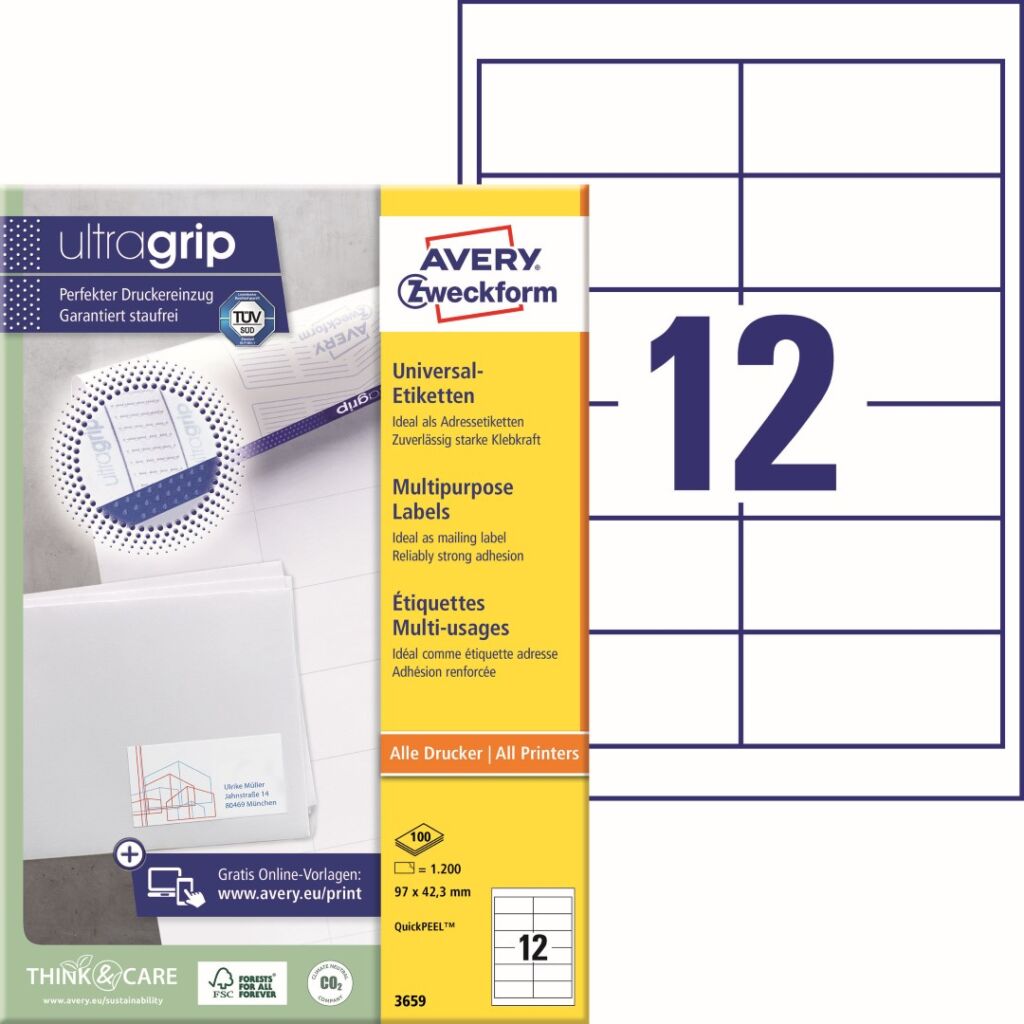 Univerzální samolepící etikety Avery Zweckform 3659 do kanceláře, obchodu i domácnosti. Vysoká a stálá lepivost na běžných površích jako papír, karton, sklo a plast. Díky praktické pomůcce QuickPEEL™ můžete jednotlivé etikety z lineru odlepovat snadno a rychle. Novinka! Unikátní výrobní technologie Ultragrip – do oblasti záhlaví, zápatí a na boční okraje zadní strany archu s etiketami aplikovaná jemná vrstva laku a 3D strukturovaný povrch, který společně s vyznačenými okraji a vodícími linkami zaručí bezchybné natažení archu do tiskárny a absolutně přesný tisk bez rizika uvíznutí archu v tiskárně. Ukázka viz Videa (záložka výše). Při tisku se můžete spolehnout na čtyřstranný bezpečnostní okraj QCT (Quattro Clean Technology), který zabraňuje vytékání a usazování lepidla v tiskárně a ostrý tiskový výstup, který se díky vynikajícímu ukotvení tonerového prášku nebo inkoustu nerozmazává. Bezproblémový provoz laserových tiskáren testován a potvrzen certifikátem TÜV SÜD. Print etikety Avery 3659 jsou vhodné pro všechny běžné laserové i inkoustové tiskárny, kopírovací stroje a hodí se i pro psaní, resp. ruční popis.