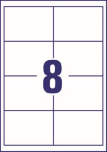 rozměr 97×67,7 mm, 220 archů A4, 1.760 ks etiket v balení (8 ks/arch), papírové, permanentní lepidlo, barva bílá. Typ tiskárny: černobílá laserová, barevná laserová, inkoustová.