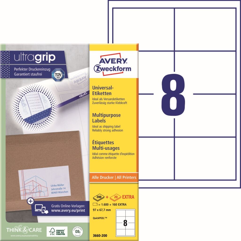 Univerzální samolepící etikety Avery Zweckform 3660-200 do kanceláře, obchodu i domácnosti. Vysoká a stálá lepivost na běžných površích jako papír, karton, sklo a plast. Díky praktické pomůcce QuickPEEL™ můžete jednotlivé etikety z lineru odlepovat snadno a rychle. Novinka! Unikátní výrobní technologie Ultragrip – do oblasti záhlaví, zápatí a na boční okraje zadní strany archu s etiketami aplikovaná jemná vrstva laku a 3D strukturovaný povrch, který společně s vyznačenými okraji a vodícími linkami zaručí bezchybné natažení archu do tiskárny a absolutně přesný tisk bez rizika uvíznutí archu v tiskárně. Ukázka viz Videa (záložka výše). Při tisku se můžete spolehnout na čtyřstranný bezpečnostní okraj QCT (Quattro Clean Technology), který zabraňuje vytékání a usazování lepidla v tiskárně a ostrý tiskový výstup, který se díky vynikajícímu ukotvení tonerového prášku nebo inkoustu nerozmazává. Bezproblémový provoz laserových tiskáren testován a potvrzen certifikátem TÜV SÜD. Samolepící štítky Avery 3660-200 jsou vhodné pro všechny běžné laserové i inkoustové tiskárny, kopírovací stroje a hodí se i pro psaní, resp. ruční popis.