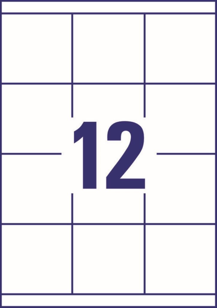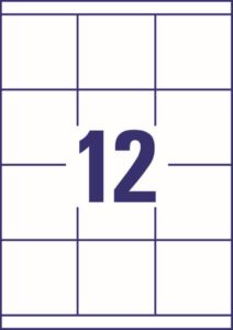 rozměr 70×67,7 mm, 100 archů A4, 1.200 ks etiket v balení (12 ks/arch), papírové, permanentní lepidlo, barva bílá. Typ tiskárny: černobílá laserová, barevná laserová, inkoustová.