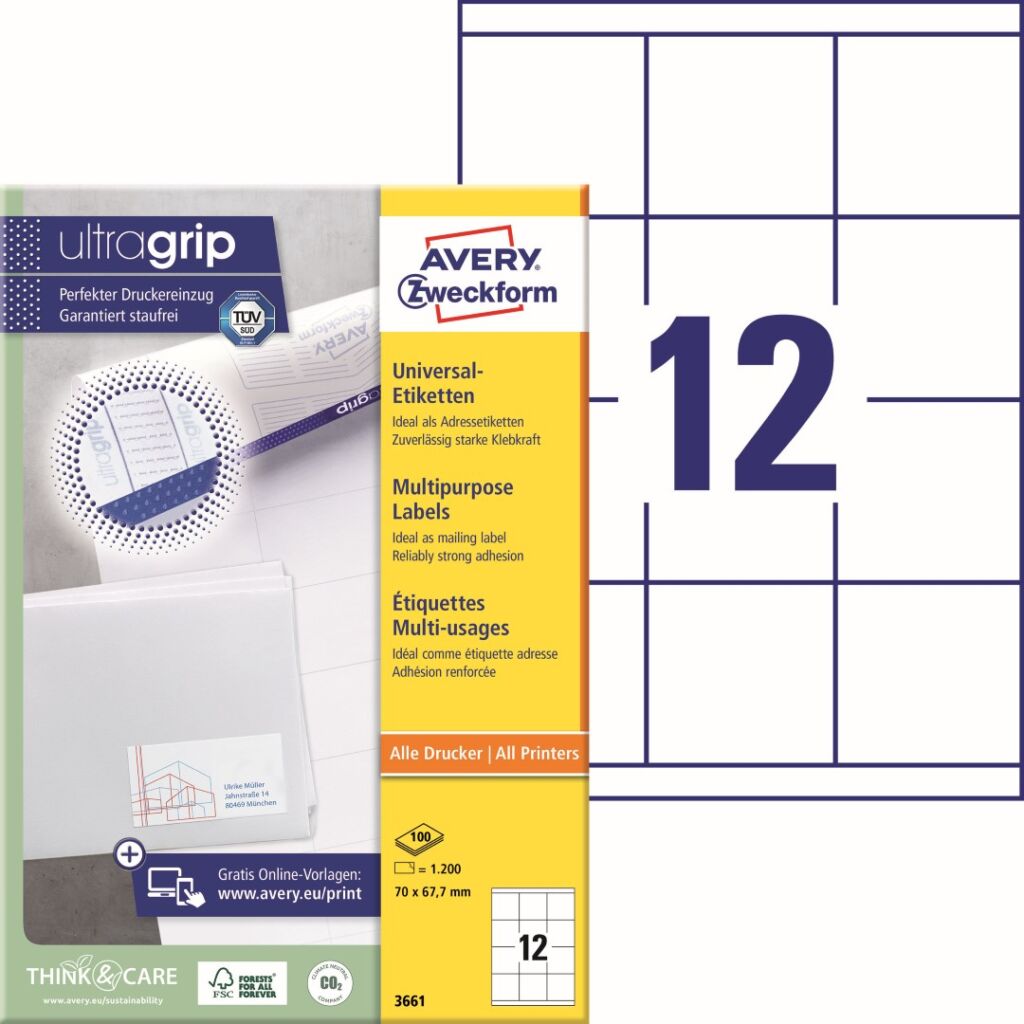 Univerzální samolepící etikety Avery Zweckform 3661 do kanceláře, obchodu i domácnosti. Vysoká a stálá lepivost na běžných površích jako papír, karton, sklo a plast. Novinka! Unikátní výrobní technologie Ultragrip – do oblasti záhlaví, zápatí a na boční okraje zadní strany archu s etiketami aplikovaná jemná vrstva laku a 3D strukturovaný povrch, který společně s vyznačenými okraji a vodícími linkami zaručí bezchybné natažení archu do tiskárny a absolutně přesný tisk bez rizika uvíznutí archu v tiskárně. Ukázka viz Videa (záložka výše). Při tisku se můžete spolehnout na čtyřstranný bezpečnostní okraj QCT (Quattro Clean Technology), který zabraňuje vytékání a usazování lepidla v tiskárně a ostrý tiskový výstup, který se díky vynikajícímu ukotvení tonerového prášku nebo inkoustu nerozmazává. Bezproblémový provoz laserových tiskáren testován a potvrzen certifikátem TÜV SÜD. Print etikety Avery 3661 jsou vhodné pro všechny běžné laserové i inkoustové tiskárny, kopírovací stroje a hodí se i pro psaní, resp. ruční popis.