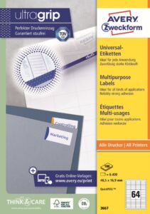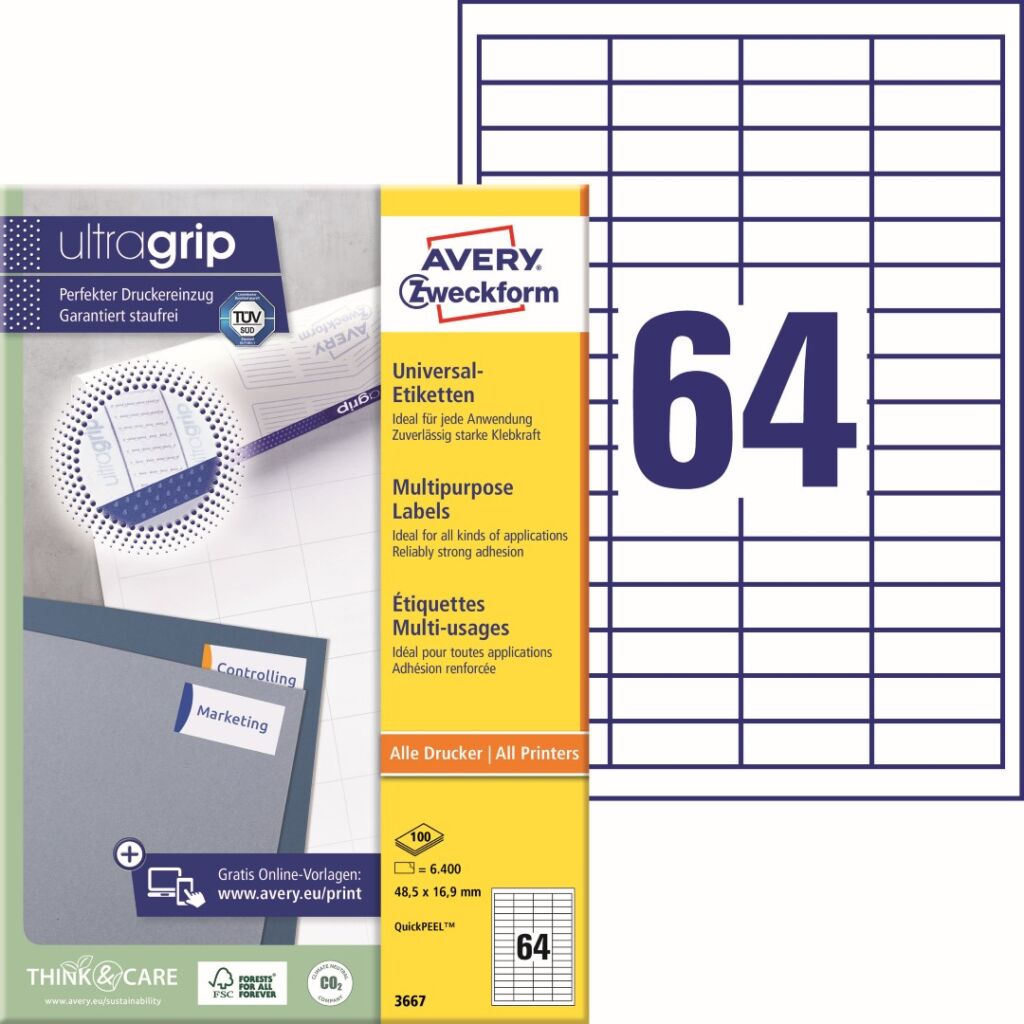 Univerzální samolepící etikety Avery Zweckform 3667 do kanceláře, obchodu i domácnosti. Vysoká a stálá lepivost na běžných površích jako papír, karton, sklo a plast. Díky praktické pomůcce QuickPEEL™ můžete jednotlivé etikety z lineru odlepovat snadno a rychle. Novinka! Unikátní výrobní technologie Ultragrip – do oblasti záhlaví, zápatí a na boční okraje zadní strany archu s etiketami aplikovaná jemná vrstva laku a 3D strukturovaný povrch, který společně s vyznačenými okraji a vodícími linkami zaručí bezchybné natažení archu do tiskárny a absolutně přesný tisk bez rizika uvíznutí archu v tiskárně. Ukázka viz Videa (záložka výše). Při tisku se můžete spolehnout na čtyřstranný bezpečnostní okraj QCT (Quattro Clean Technology), který zabraňuje vytékání a usazování lepidla v tiskárně a ostrý tiskový výstup, který se díky vynikajícímu ukotvení tonerového prášku nebo inkoustu nerozmazává. Bezproblémový provoz laserových tiskáren testován a potvrzen certifikátem TÜV SÜD. Samolepící print etikety Avery 3667 jsou vhodné pro všechny běžné laserové i inkoustové tiskárny, kopírovací stroje a hodí se i pro psaní, resp. ruční popis.