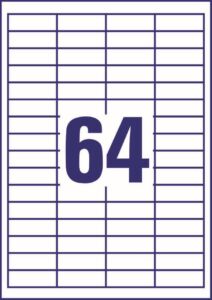 rozměr 48,5×16,9 mm, 100 archů A4, 6.400 ks etiket v balení (64 ks/arch), papírové, permanentní lepidlo, barva bílá. Typ tiskárny: černobílá laserová, barevná laserová, inkoustová.