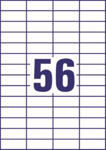 rozměr 52,5×21,2 mm, 100 archů A4, 5.600 ks etiket v balení (56 ks/arch), papírové, permanentní lepidlo, barva bílá. Typ tiskárny: černobílá laserová, barevná laserová, inkoustová.