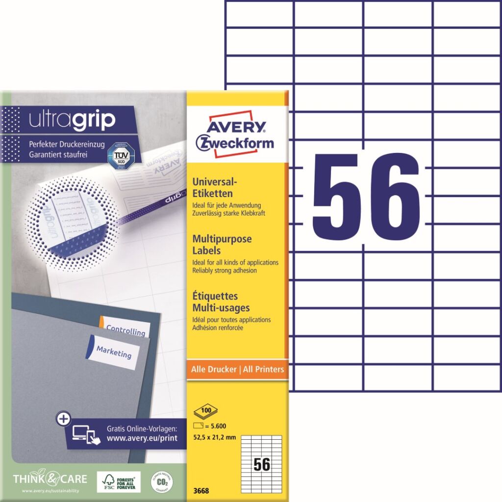 Univerzální samolepící etikety Avery Zweckform 3668 do kanceláře, obchodu i domácnosti. Vysoká a stálá lepivost na běžných površích jako papír, karton, sklo a plast. Novinka! Unikátní výrobní technologie Ultragrip – do oblasti záhlaví, zápatí a na boční okraje zadní strany archu s etiketami aplikovaná jemná vrstva laku a 3D strukturovaný povrch, který společně s vyznačenými okraji a vodícími linkami zaručí bezchybné natažení archu do tiskárny a absolutně přesný tisk bez rizika uvíznutí archu v tiskárně. Ukázka viz Videa (záložka výše). Při tisku se můžete spolehnout na čtyřstranný bezpečnostní okraj QCT (Quattro Clean Technology), který zabraňuje vytékání a usazování lepidla v tiskárně a ostrý tiskový výstup, který se díky vynikajícímu ukotvení tonerového prášku nebo inkoustu nerozmazává. Bezproblémový provoz laserových tiskáren testován a potvrzen certifikátem TÜV SÜD. Print etikety Avery 3668 jsou vhodné pro všechny běžné laserové i inkoustové tiskárny, kopírovací stroje a hodí se i pro psaní, resp. ruční popis.