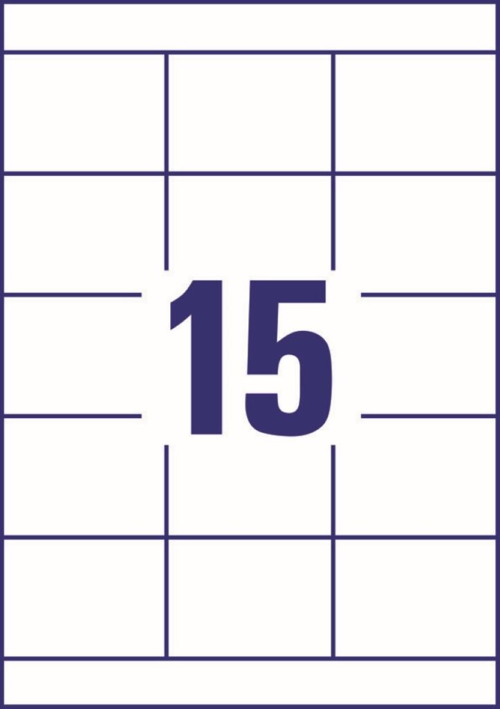 rozměr 70×50,8 mm, 100 archů A4, 1.500 ks etiket v balení (15 ks/arch), papírové, permanentní lepidlo, barva bílá. Typ tiskárny: černobílá laserová, barevná laserová, inkoustová.