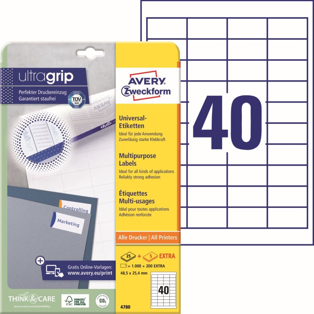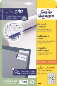 Univerzální samolepící etikety Avery Zweckform 4780 do kanceláře, obchodu i domácnosti. Vysoká a stálá lepivost na běžných površích jako papír, karton, sklo a plast. Díky praktické pomůcce QuickPEEL™ můžete jednotlivé etikety z lineru odlepovat snadno a rychle. Novinka! Unikátní výrobní technologie Ultragrip – do oblasti záhlaví, zápatí a na boční okraje zadní strany archu s etiketami aplikovaná jemná vrstva laku a 3D strukturovaný povrch, který společně s vyznačenými okraji a vodícími linkami zaručí bezchybné natažení archu do tiskárny a absolutně přesný tisk bez rizika uvíznutí archu v tiskárně. Ukázka viz Videa (záložka výše). Při tisku se můžete spolehnout na čtyřstranný bezpečnostní okraj QCT (Quattro Clean Technology), který zabraňuje vytékání a usazování lepidla v tiskárně a ostrý tiskový výstup, který se díky vynikajícímu ukotvení tonerového prášku nebo inkoustu nerozmazává. Bezproblémový provoz laserových tiskáren testován a potvrzen certifikátem TÜV SÜD. Samolepící štítky A4 Avery 4780 jsou vhodné pro všechny běžné laserové i inkoustové tiskárny, kopírovací stroje a hodí se i pro psaní, resp. ruční popis.