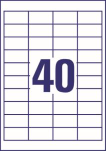 rozměr 48,5×25,4 mm, 30 archů A4, 1.200 ks etiket v balení (40 ks/arch), papírové, permanentní lepidlo, barva bílá. Typ tiskárny: černobílá laserová, barevná laserová, inkoustová.