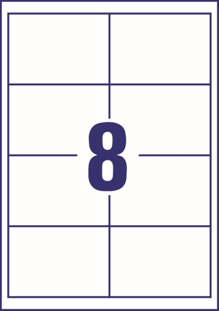 rozměr 97×67,7 mm, 30 archů A4, 240 ks etiket v balení (8 ks/arch), papírové, permanentní lepidlo, barva bílá. Typ tiskárny: černobílá laserová, barevná laserová, inkoustová.