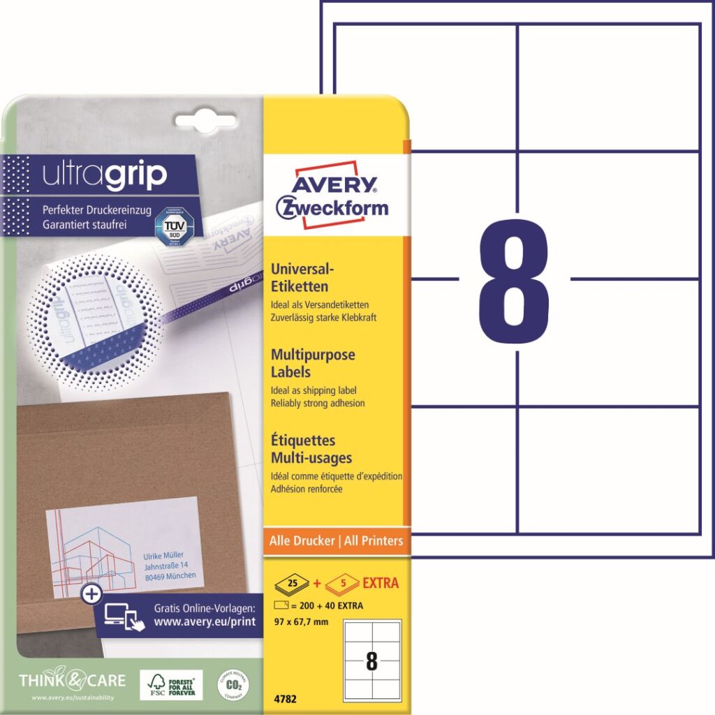 Univerzální samolepící etikety Avery Zweckform 4782 do kanceláře, obchodu i domácnosti. Vysoká a stálá lepivost na běžných površích jako papír, karton, sklo a plast. Díky praktické pomůcce QuickPEEL™ můžete jednotlivé etikety z lineru odlepovat snadno a rychle. Novinka! Unikátní výrobní technologie Ultragrip – do oblasti záhlaví, zápatí a na boční okraje zadní strany archu s etiketami aplikovaná jemná vrstva laku a 3D strukturovaný povrch, který společně s vyznačenými okraji a vodícími linkami zaručí bezchybné natažení archu do tiskárny a absolutně přesný tisk bez rizika uvíznutí archu v tiskárně. Ukázka viz Videa (záložka výše). Při tisku se můžete spolehnout na čtyřstranný bezpečnostní okraj QCT (Quattro Clean Technology), který zabraňuje vytékání a usazování lepidla v tiskárně a ostrý tiskový výstup, který se díky vynikajícímu ukotvení tonerového prášku nebo inkoustu nerozmazává. Bezproblémový provoz laserových tiskáren testován a potvrzen certifikátem TÜV SÜD. Samolepící etikety A4 Avery 4782 jsou vhodné pro všechny běžné laserové i inkoustové tiskárny, kopírovací stroje a hodí se i pro psaní, resp. ruční popis.