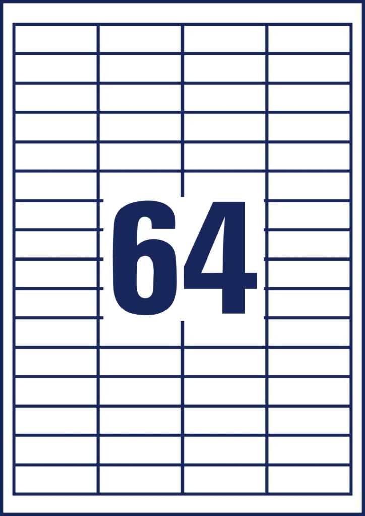rozměr 48,5×16,9 mm, 30 archů A4, 1.920 ks etiket v balení (64 ks/arch), papírové, permanentní lepidlo, barva bílá. Typ tiskárny: černobílá laserová, barevná laserová, inkoustová.