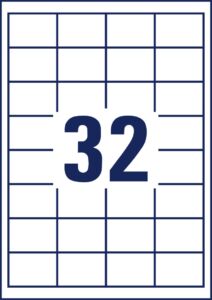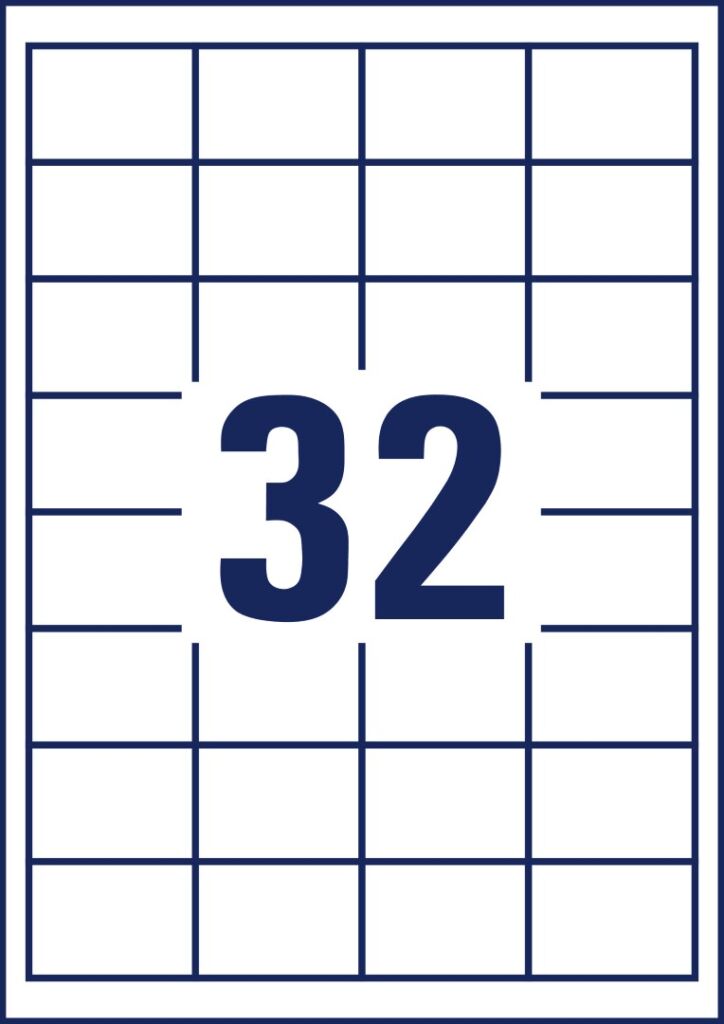 rozměr 48,3×33,8 mm, 30 archů A4, 960 ks etiket v balení (32 ks/arch), papírové, permanentní lepidlo, barva bílá. Typ tiskárny: černobílá laserová, barevná laserová, inkoustová.