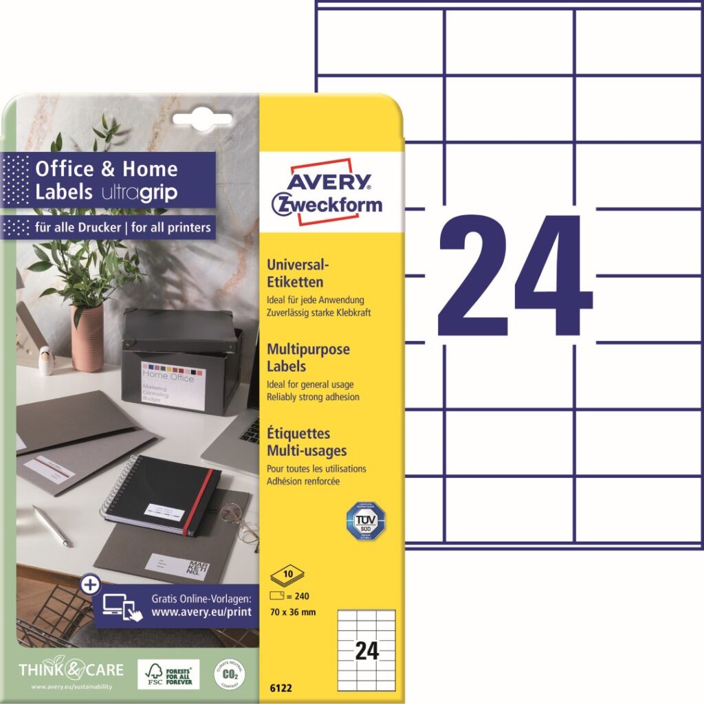 rozměr 70×36 mm, 10 archů A4, 240 ks etiket v balení (24 ks/arch), papírové, permanentní lepidlo, barva bílá. Typ tiskárny: černobílá laserová, barevná laserová, inkoustová.