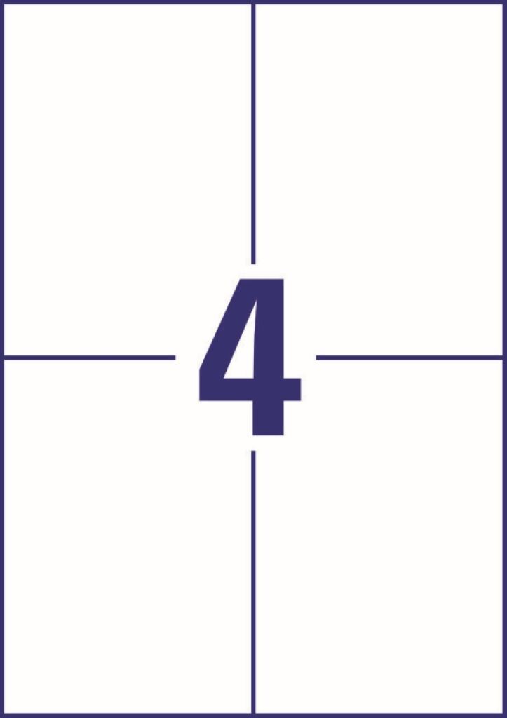 rozměr 105×148 mm, 10 archů A4, 40 ks etiket v balení (4 ks/arch), papírové, permanentní lepidlo, barva bílá. Typ tiskárny: černobílá laserová, barevná laserová, inkoustová.