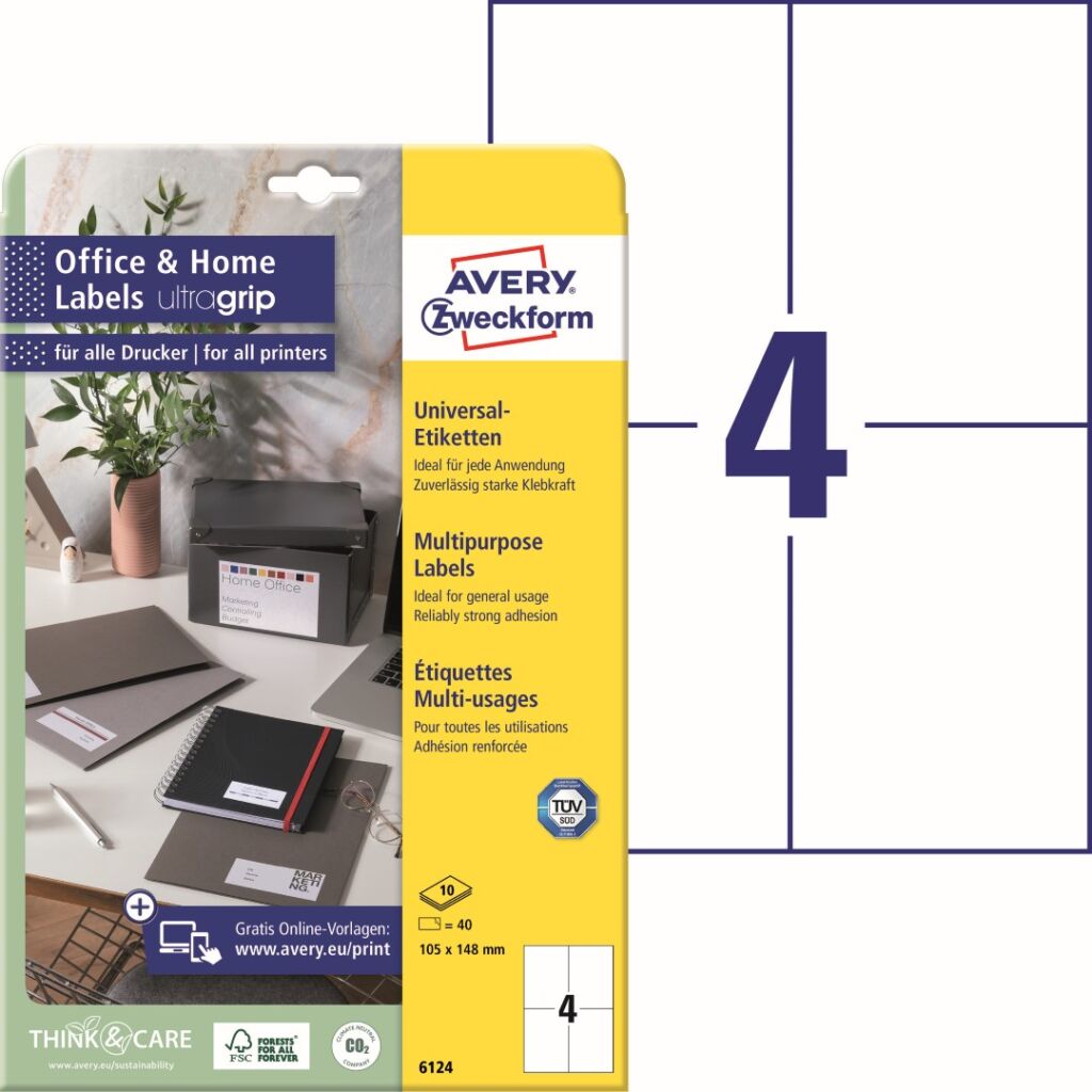 Univerzální samolepící etikety Avery Zweckform 6124 do kanceláře, obchodu i domácnosti. Vysoká a stálá lepivost na běžných površích jako papír, karton, sklo a plast. Novinka! Unikátní výrobní technologie Ultragrip – do oblasti záhlaví, zápatí a na boční okraje zadní strany archu s etiketami aplikovaná jemná vrstva laku a 3D strukturovaný povrch, který společně s vyznačenými okraji a vodícími linkami zaručí bezchybné natažení archu do tiskárny a absolutně přesný tisk bez rizika uvíznutí archu v tiskárně. Ukázka viz Videa (záložka výše). Při tisku se můžete spolehnout na čtyřstranný bezpečnostní okraj QCT (Quattro Clean Technology), který zabraňuje vytékání a usazování lepidla v tiskárně a ostrý tiskový výstup, který se díky vynikajícímu ukotvení tonerového prášku nebo inkoustu nerozmazává. Bezproblémový provoz laserových tiskáren testován a potvrzen certifikátem TÜV SÜD. Bílé samolepící štítky Avery 6124 jsou vhodné pro všechny běžné laserové i inkoustové tiskárny, kopírovací stroje a hodí se i pro psaní, resp. ruční popis.