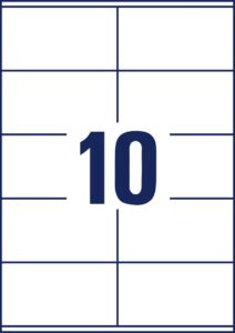 rozměr 105×57 mm, 30 archů A4, 300 ks etiket v balení (10 ks/arch), papírové, permanentní lepidlo, barva bílá. Typ tiskárny: černobílá laserová, barevná laserová, inkoustová.