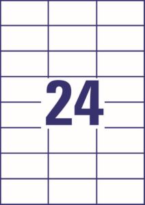 rozměr 70×37 mm, 30 archů A4, 720 ks etiket v balení (24 ks/arch), papírové, permanentní lepidlo, barva bílá. Typ tiskárny: černobílá laserová, barevná laserová, inkoustová.