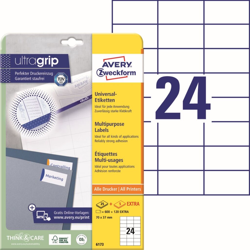 Univerzální samolepící etikety Avery Zweckform 6173 do kanceláře, obchodu i domácnosti. Vysoká a stálá lepivost na běžných površích jako papír, karton, sklo a plast. Novinka! Unikátní výrobní technologie Ultragrip – do oblasti záhlaví, zápatí a na boční okraje zadní strany archu s etiketami aplikovaná jemná vrstva laku a 3D strukturovaný povrch, který společně s vyznačenými okraji a vodícími linkami zaručí bezchybné natažení archu do tiskárny a absolutně přesný tisk bez rizika uvíznutí archu v tiskárně. Ukázka viz Videa (záložka výše). Při tisku se můžete spolehnout na čtyřstranný bezpečnostní okraj QCT (Quattro Clean Technology), který zabraňuje vytékání a usazování lepidla v tiskárně a ostrý tiskový výstup, který se díky vynikajícímu ukotvení tonerového prášku nebo inkoustu nerozmazává. Bezproblémový provoz laserových tiskáren testován a potvrzen certifikátem TÜV SÜD. Samolepící štítky A4 Avery 6173 jsou vhodné pro všechny běžné laserové i inkoustové tiskárny, kopírovací stroje a hodí se i pro psaní, resp. ruční popis.