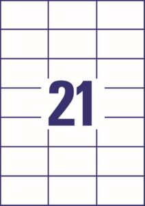rozměr 70×42,3 mm, 30 archů A4, 630 ks etiket v balení (21 ks/arch), papírové, permanentní lepidlo, barva bílá. Typ tiskárny: černobílá laserová, barevná laserová, inkoustová.