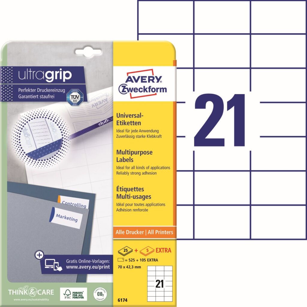 Univerzální samolepící etikety Avery Zweckform 6174 do kanceláře, obchodu i domácnosti. Vysoká a stálá lepivost na běžných površích jako papír, karton, sklo a plast. Novinka! Unikátní výrobní technologie Ultragrip – do oblasti záhlaví, zápatí a na boční okraje zadní strany archu s etiketami aplikovaná jemná vrstva laku a 3D strukturovaný povrch, který společně s vyznačenými okraji a vodícími linkami zaručí bezchybné natažení archu do tiskárny a absolutně přesný tisk bez rizika uvíznutí archu v tiskárně. Ukázka viz Videa (záložka výše). Při tisku se můžete spolehnout na čtyřstranný bezpečnostní okraj QCT (Quattro Clean Technology), který zabraňuje vytékání a usazování lepidla v tiskárně a ostrý tiskový výstup, který se díky vynikajícímu ukotvení tonerového prášku nebo inkoustu nerozmazává. Bezproblémový provoz laserových tiskáren testován a potvrzen certifikátem TÜV SÜD. Samolepící štítky A4 Avery 6174 jsou vhodné pro všechny běžné laserové i inkoustové tiskárny, kopírovací stroje a hodí se i pro psaní, resp. ruční popis.