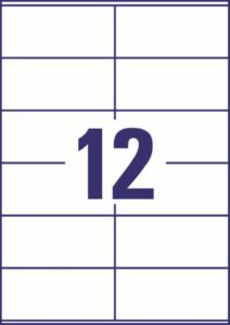 rozměr 105×48 mm, 30 archů A4, 360 ks etiket v balení (12 ks/arch), papírové, permanentní lepidlo, barva bílá. Typ tiskárny: černobílá laserová, barevná laserová, inkoustová.