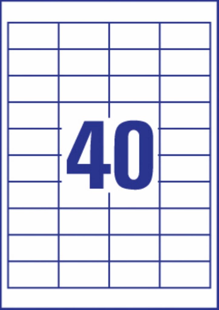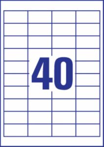 rozměr 48,5×25,4 mm, 100 archů A4, 4.000 ks etiket v balení (40 ks/arch), papírové, permanentní lepidlo, barva bílá. Typ tiskárny: černobílá laserová, barevná laserová, inkoustová.