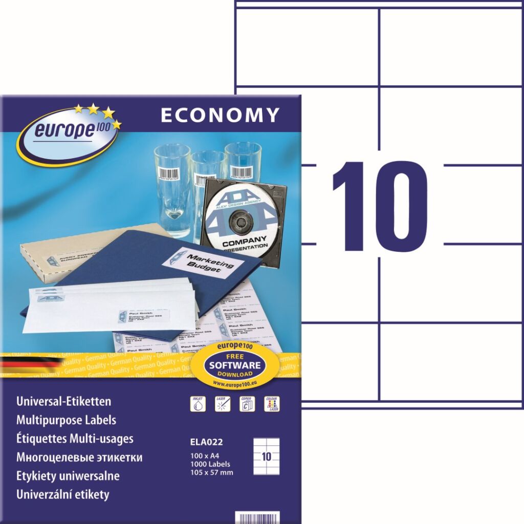 Univerzální samolepící etikety Europe100 ELA022 do kanceláře, obchodu i domácnosti. Ideální na popis výrobků, označování zboží, jako adresní etikety, samolepky na zásilky, přepravní štítky atd. Print etikety Europe100 – vysoká lepivost, bezproblémový průjezd archů tiskárnou a ostré tiskové výsledky bez rozmazávání. Samozřejmostí je čtyřstranný bezpečnostní okraj QCT (Quattro Clean Technology), který zabraňuje vytékání a usazování lepidla v tiskárně. Profesionální kvalita za přesvědčivou cenu! Samolepící štítky Europe100 ELA022 jsou vhodné pro všechny běžné laserové i inkoustové tiskárny, kopírovací stroje a hodí se i pro psaní, resp. ruční popis.