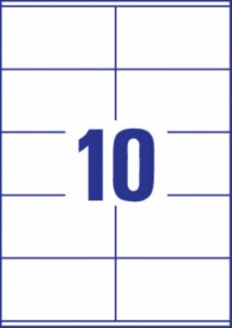 rozměr 105×57 mm, 100 archů A4, 1.000 ks etiket v balení (10 ks/arch), papírové, permanentní lepidlo, barva bílá. Typ tiskárny: černobílá laserová, barevná laserová, inkoustová.