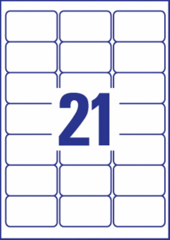 rozměr 63,5×38,1 mm, 100 archů A4, 2.100 ks etiket v balení (21 ks/arch), papírové, permanentní lepidlo, barva bílá. Typ tiskárny: černobílá laserová, barevná laserová, inkoustová.