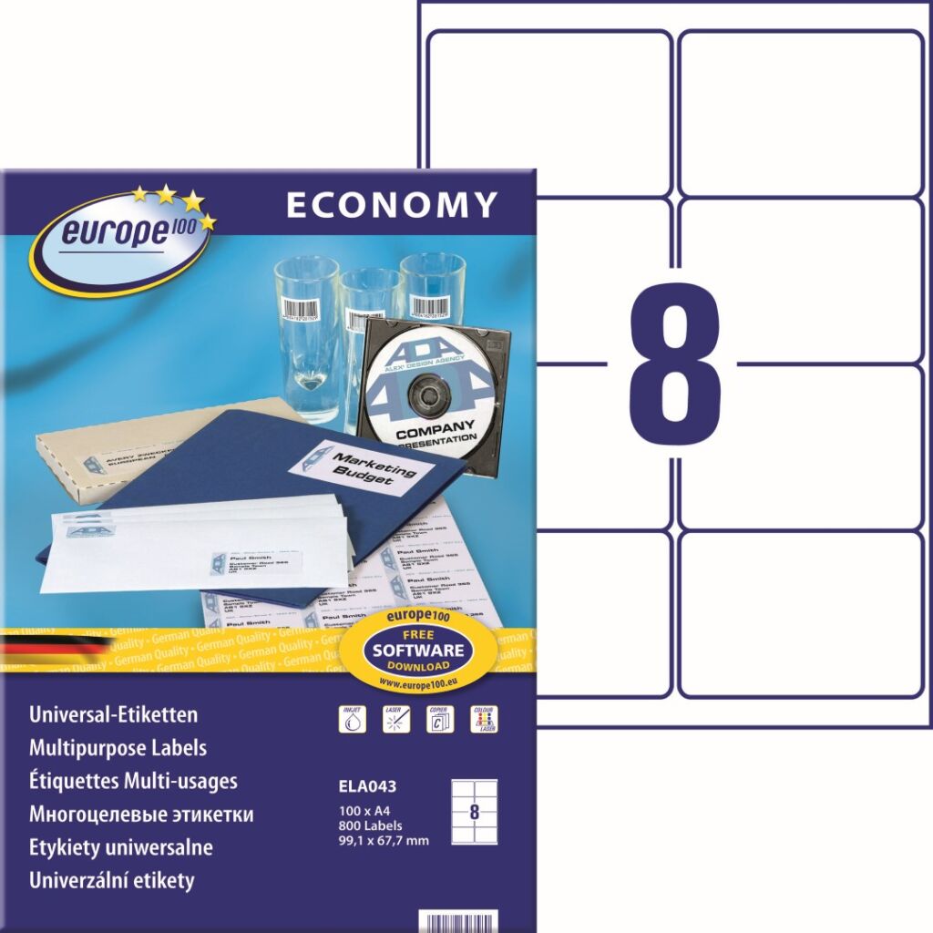 Univerzální samolepící etikety Europe100 ELA043 do kanceláře, obchodu i domácnosti. Ideální na popis výrobků, označování zboží, jako adresní etikety, samolepky na zásilky, přepravní štítky atd. Print etikety Europe100 – vysoká lepivost, bezproblémový průjezd archů tiskárnou a ostré tiskové výsledky bez rozmazávání. Samozřejmostí je čtyřstranný bezpečnostní okraj QCT (Quattro Clean Technology), který zabraňuje vytékání a usazování lepidla v tiskárně. Profesionální kvalita za přesvědčivou cenu! Samolepící štítky Europe100 ELA043 jsou vhodné pro všechny běžné laserové i inkoustové tiskárny, kopírovací stroje a hodí se i pro psaní, resp. ruční popis.
